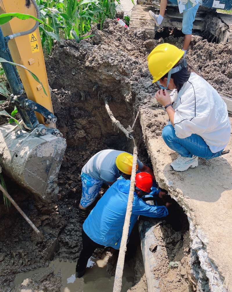 隨著調來的挖掘機清理掉外圍的泥土后,公司員工小心翼翼地沿著滲水的方向掏掉主管道外側的泥土。原來是當時鋪設管道施工時,在管道下方泥土中埋有一塊尖銳角的石頭,隨著時間的推移和公路車輛的長期輾壓,主管道下沉后被石塊擠破了壁管而造成滲漏。