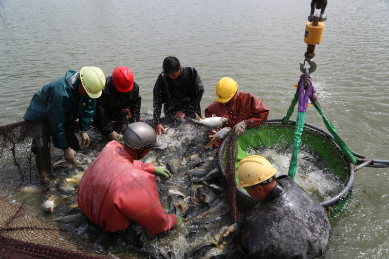初秋的早晨已然涼意十足,早上不到6點,天剛蒙蒙亮,捕撈人員就來到魚塘開網起魚。在水產公司工作人員的指揮下,一張巨大的漁網隨著捕魚工人的移動緩緩張開,大家不顧冰冷的水下溫度,緊張忙碌了起來。經過鋪底、收網、聚攏等環節的共同協作,漁網被慢慢升起……整個現場一片繁忙熱鬧景象。經過近三個小時的忙碌,在大家的精心分揀下,裝滿魚的筐子被吊車有序吊起,稱重、記錄、放魚一氣呵成。“這個吊車頂部的黃色圓塊就是電子秤,吊起魚的同時,秤上的信號就發到這個無線接收裝置上來,秤重既方便又精準。”現場記賬的方正解釋說。