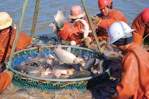 隨著2026年元旦臨近,水產市場需求量逐漸增大,江蘇省連云港市海州區積極做好鮮魚捕撈銷售工作,切實滿足節日市場需求。圖為海州區的江蘇農墾崗埠農場加緊拉網捕撈鯉魚、花鰱、白鰱等各種鮮魚,準備供應云南昆明、山東濟寧等多地市場。  徐衛 攝