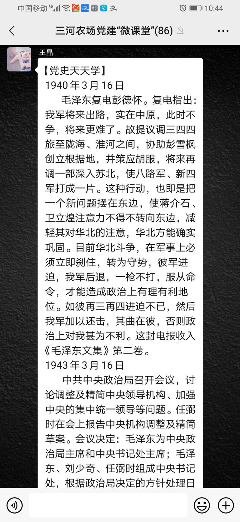 在全黨開展黨史教育之際,三河農(nóng)場(chǎng)公司在利用櫥窗、LED大屏、黨建群、微信、美篇等學(xué)習(xí)的基礎(chǔ),于3月16日利用黨建微課堂平臺(tái)開設(shè)“黨史天天學(xué)”專欄,每日在群內(nèi)推送黨史故事,黨史知識(shí),黨史上的今天等內(nèi)容,引導(dǎo)黨員通過學(xué)習(xí)黨史來汲取智慧和力量,滋養(yǎng)初心和使命。