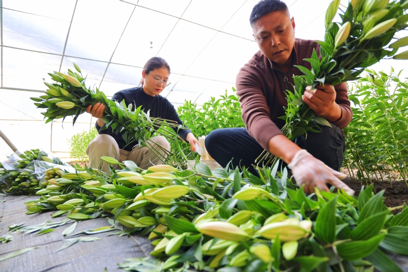 寒冬時節(jié),崗埠農(nóng)場高效農(nóng)業(yè)示范園11號大棚內(nèi)一片春意盎然。一株株百合花挺拔站立,不少花苞已露出粉色,在綠葉的襯托下格外嬌艷動人。去年,崗埠農(nóng)場高效農(nóng)業(yè)示范園大力發(fā)展鮮切花產(chǎn)業(yè),引進了“中國紅”“索蚌”等百合花品種,共種植14萬株。通過為周邊種植戶提供技術(shù)指導(dǎo),農(nóng)場帶動大家發(fā)展鮮切花產(chǎn)業(yè)。圖為工作人員正在整理百合鮮切花。